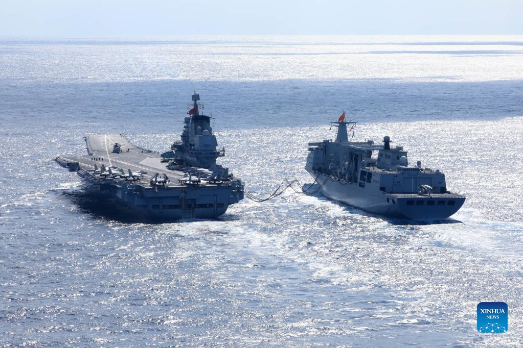 Undated file photo shows the Chinese navy's Liaoning (L) aircraft-carrier receiving supplies during open-sea combat training. The Chinese navy's Liaoning aircraft-carrier formation returned on Dec. 30, 2021 to a military port in Qingdao, east China's Shandong Province, concluding 20-plus days of open-sea combat training. The exercise, which began on Dec. 9, took the formation into various waters, from the Yellow Sea to the East China Sea and the West Pacific, and has improved the formation's combat capability, according to an official statement. (Photo by Hu Shanmin/Xinhua)