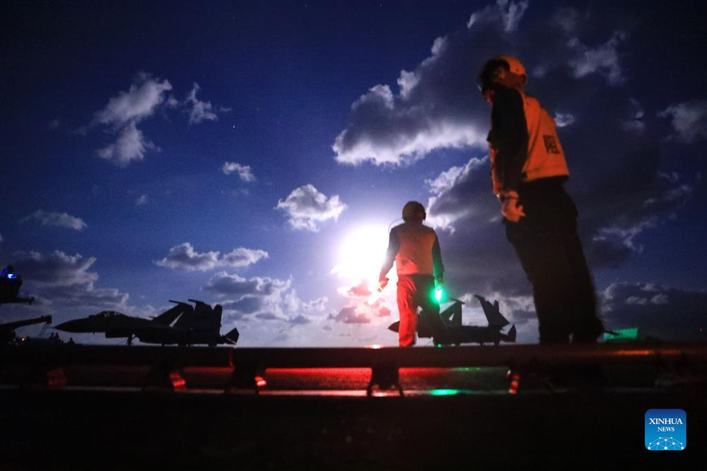 Undated file photo shows a carrier-based J-15 fighter jet taking part in a night operation during open-sea combat training. The Chinese navy's Liaoning aircraft-carrier formation returned on Dec. 30, 2021 to a military port in Qingdao, east China's Shandong Province, concluding 20-plus days of open-sea combat training. The exercise, which began on Dec. 9, took the formation into various waters, from the Yellow Sea to the East China Sea and the West Pacific, and has improved the formation's combat capability, according to an official statement. (Photo by Zhang Kai/Xinhua)