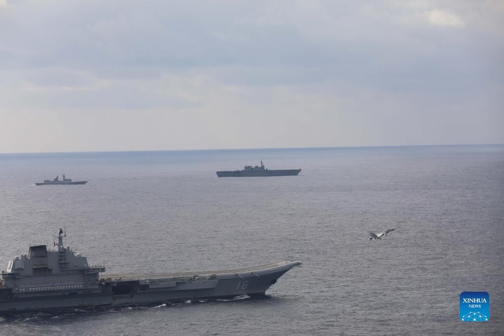 Undated file photo shows the Chinese navy's Liaoning aircraft-carrier formation conducting open-sea combat training. The Chinese navy's Liaoning aircraft-carrier formation returned on Dec. 30, 2021 to a military port in Qingdao, east China's Shandong Province, concluding 20-plus days of open-sea combat training. The exercise, which began on Dec. 9, took the formation into various waters, from the Yellow Sea to the East China Sea and the West Pacific, and has improved the formation's combat capability, according to an official statement. (Xinhua)