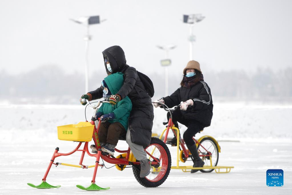 Tourists have fun on frozen Songhua River at an ice-snow theme park in Harbin, northeast China's Heilongjiang Province, Dec. 30, 2021. (Xinhua/Zhang Tao)