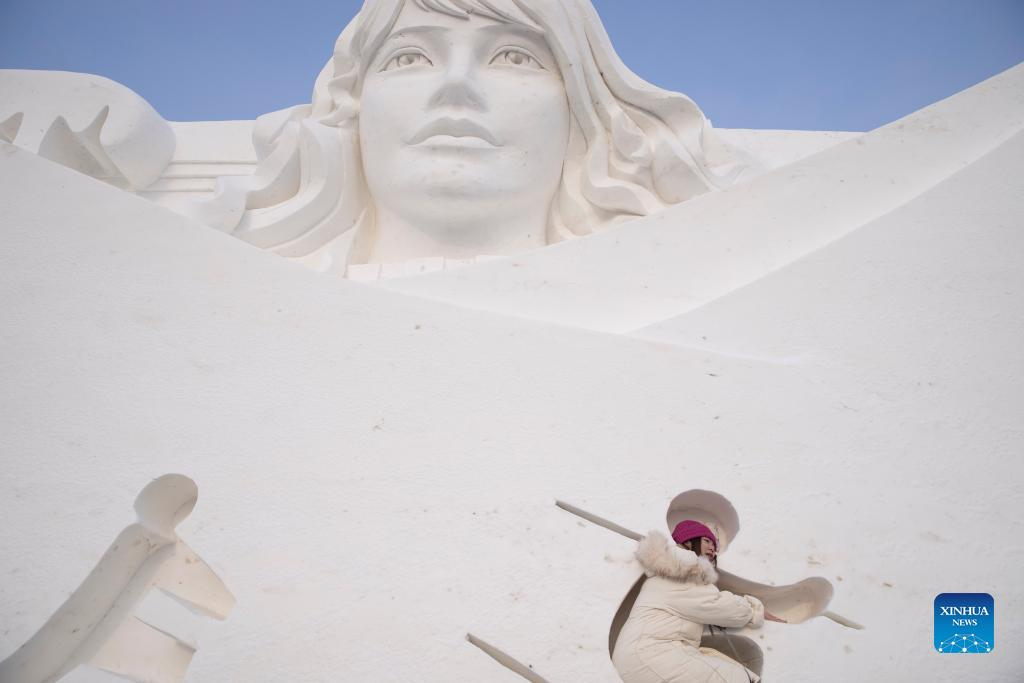 A tourist has fun at an ice-snow theme park in Harbin, northeast China's Heilongjiang Province, Dec. 30, 2021. (Xinhua/Zhang Tao)