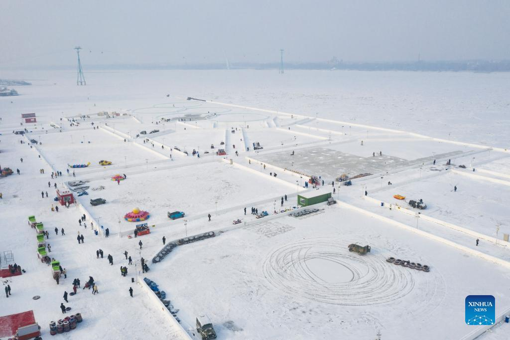 Aerial photo shows a view of an ice-snow theme park in Harbin, northeast China's Heilongjiang Province, Dec. 30, 2021. (Xinhua/Xie Jianfei)