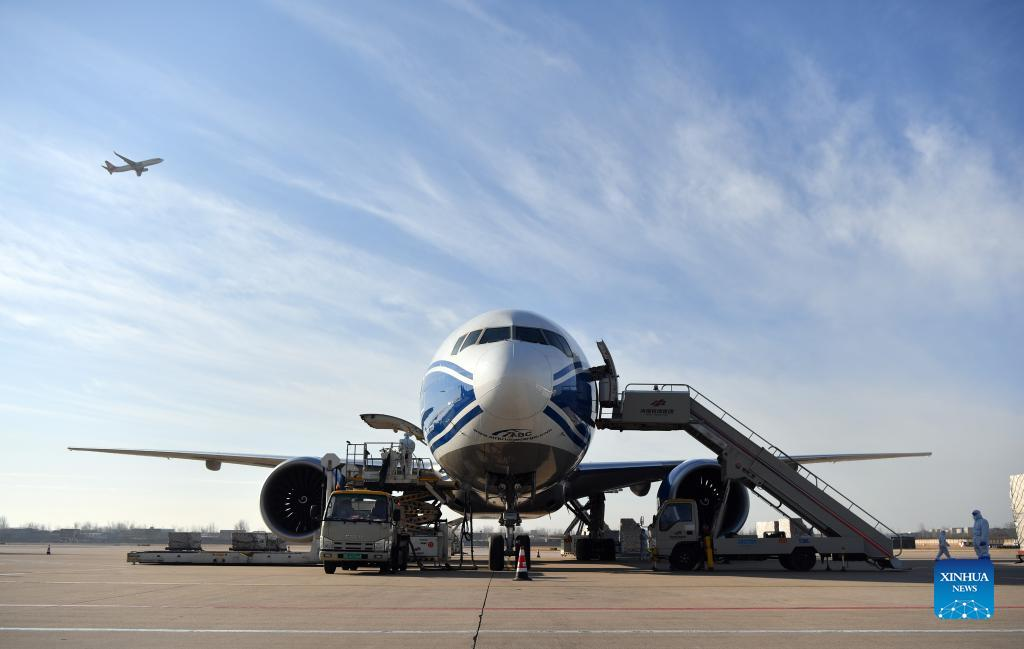 Staff prepare to load an air freighter of Russian AirBridgeCargo at Xinzheng International Airport in Zhengzhou, central China's Henan Province, Dec. 30, 2021. The annual cargo throughput of Xinzheng International Airport in Zhengzhou of Henan exceeded 700,000 tonnes Thursday. (Xinhua/Li Jianan)