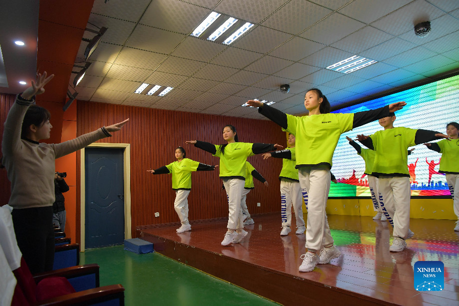 Fan Haiyan (1st L) and her students rehearse dancing at the special education school in Yichun City of east China's Jiangxi Province, Dec. 28, 2021. Fan Haiyan, a teacher of the special education school in Yichun City, learned sign language in her spare time to improve her teaching of students with hearing impairment. After years of practice, Fan could convey message quickly and correctly to her students when creating choreography or rehearsing dance routines. Fan and her students have participated in many art competitions these years, through which these children have found happiness and self-confidence. (Xinhua/Peng Zhaozhi)