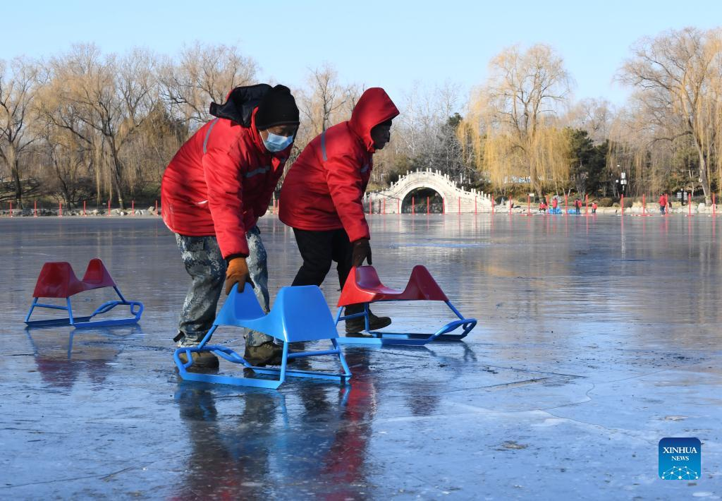 Staff members prepare sleds on a frozen lake at Yuanmingyuan Park in Beijing, capital of China, Dec. 30, 2021. The Old Summer Palace, or Yuanmingyuan, announced on Thursday that it will hold a ice and snow festival which opens around New Year's day in 2022 and lasts until February to welcome the Beijing 2022 Winter Olympic Games. (Xinhua/Luo Xiaoguang)