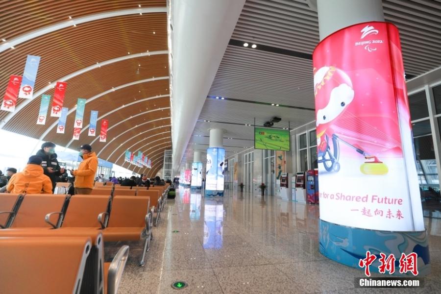 The waiting hall of Taizicheng station of the Beijing-Zhangjiakou high-speed railway line is full of winter Olympic elements, Dec. 30, 2021. (China News Service/Jia Tianyong)