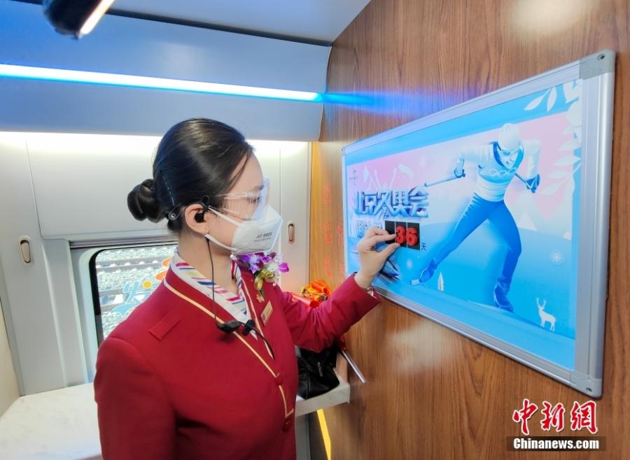 A stewardess on the G8812 high speed train changes the countdown number of the start of Beijing winter Olympics, Dec. 30, 2021.(China News Service/Jia Tianyong)