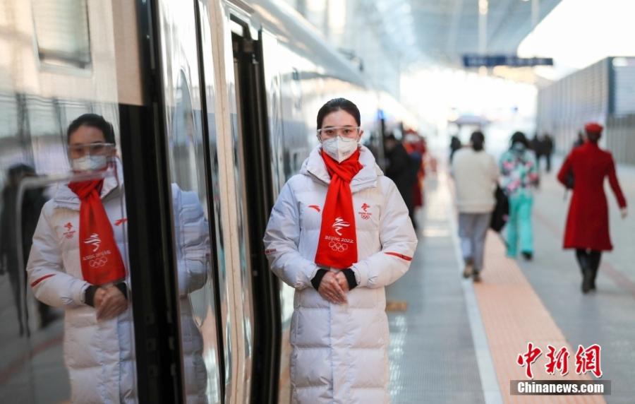Staff of G8811 high speed train greet passengers at Beijing North Railway Station in Beijing, Dec. 30, 2021. (China News Service/Jia Tianyong)