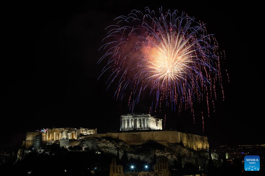 Fireworks explode by the Acropolis during the New Year celebrations in Athens, Greece, Jan. 1, 2022. (Xinhua/Marios Lolos)