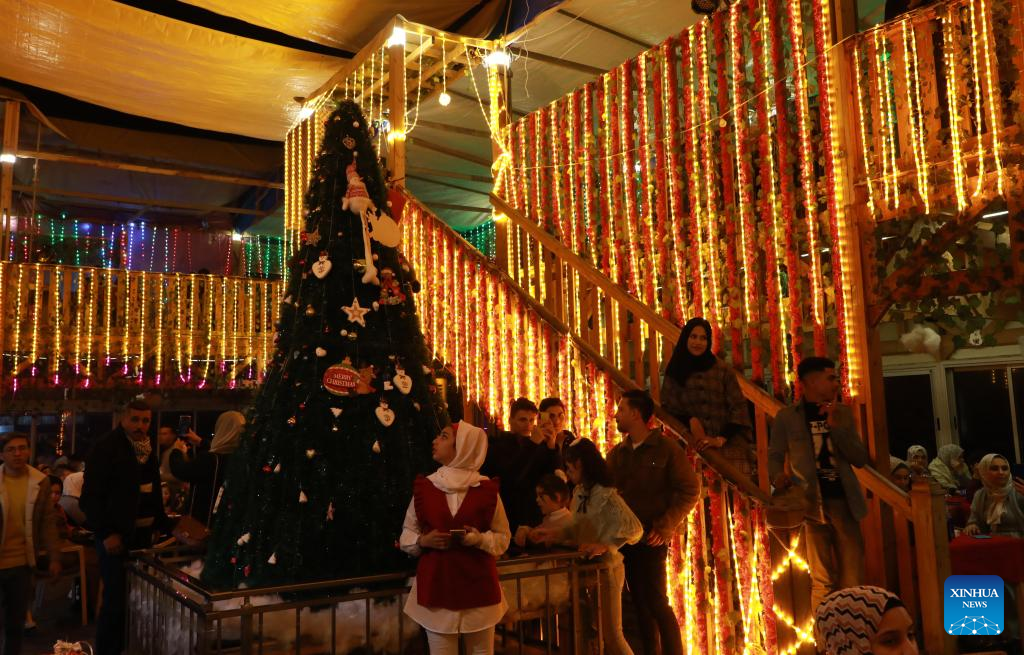 People celebrate the New Year at a restaurant in Gaza City, on Dec. 31, 2021. (Photo by Rizek Abdeljawad/Xinhua)