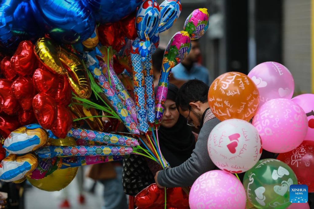 A vendor sells balloons for the New Year celebrations in Gaza City, on Dec. 31, 2021. (Photo by Rizek Abdeljawad/Xinhua)
