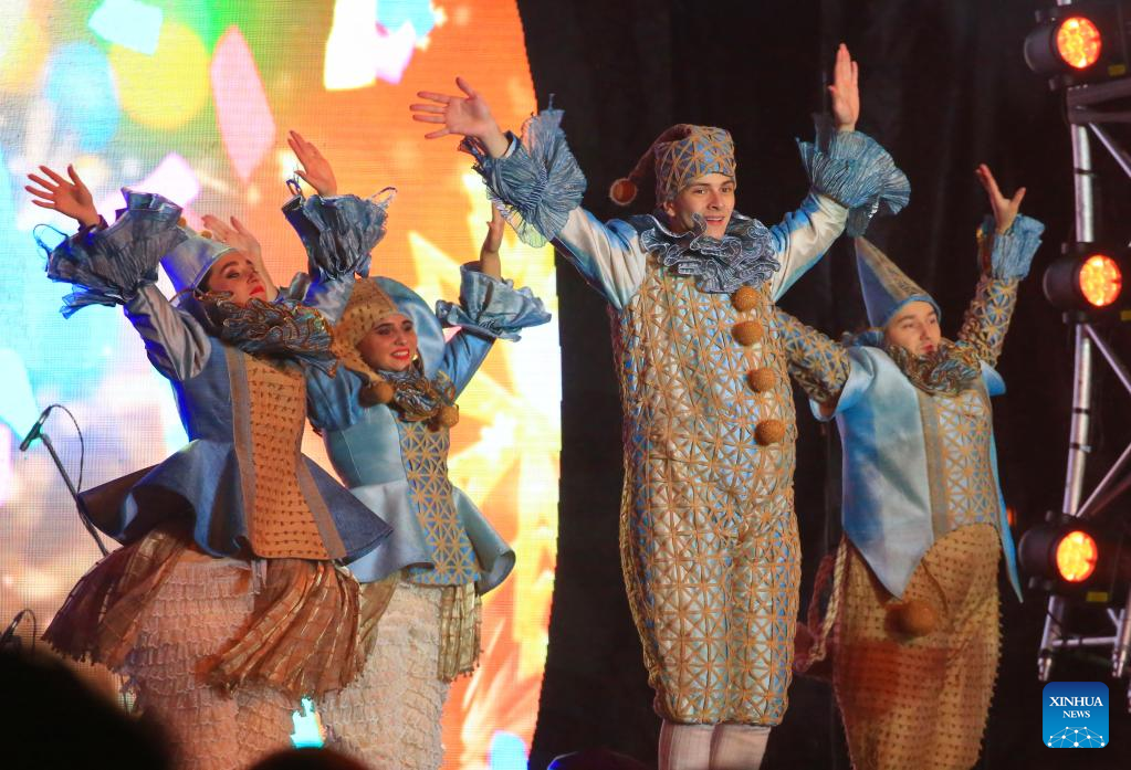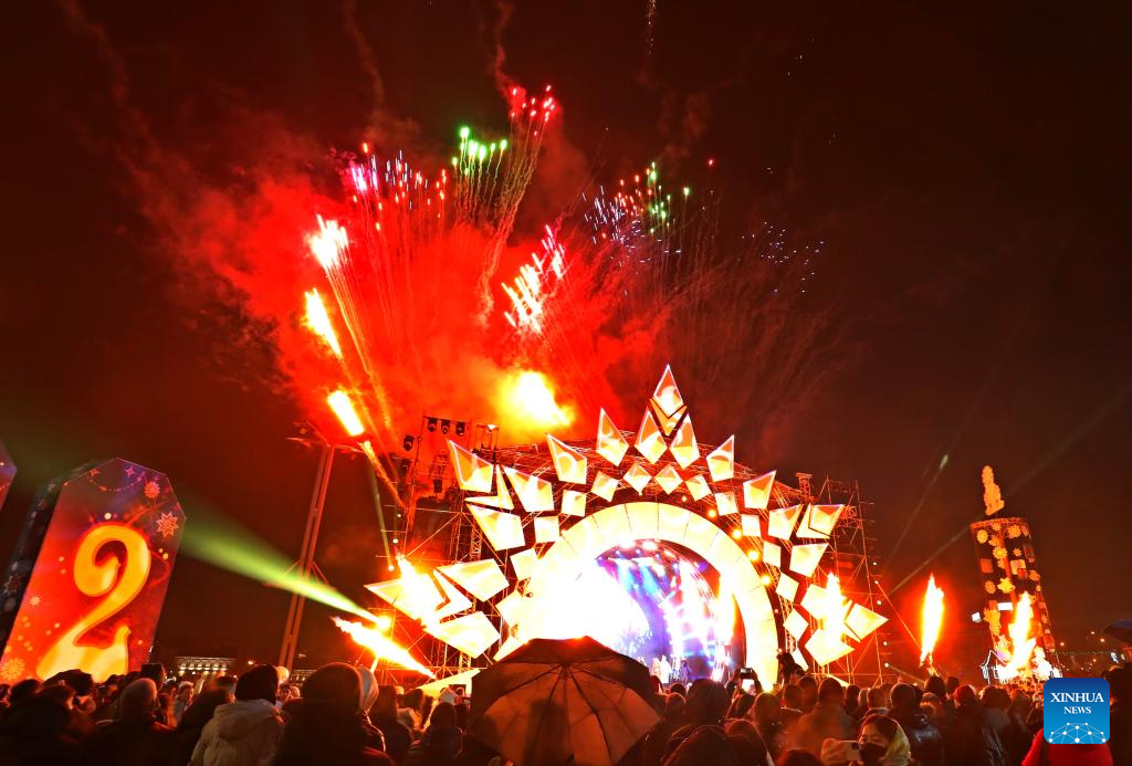 A performance is staged during New Year celebrations in Minsk, Belarus, Jan. 1, 2022. (Photo by Henadz Zhinkov/Xinhua)