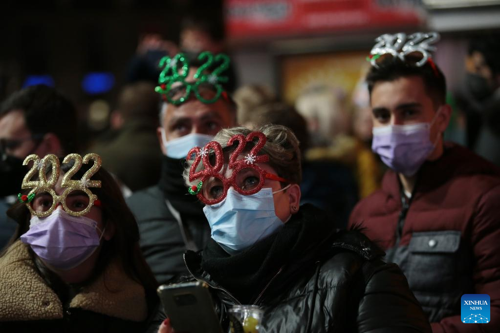 People wait to celebrate the New Year at Sol Plaza in Madrid, Spain, Dec. 31, 2021. (Photo by Juan Carlos Rojas/Xinhua)