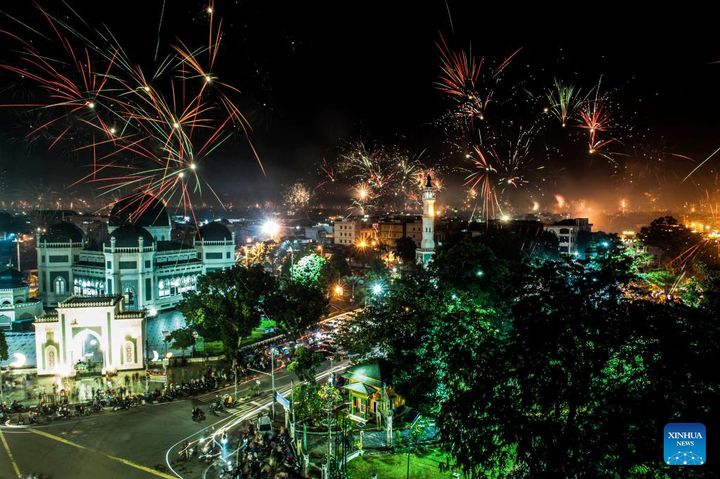 Fireworks explode in Medan, Indonesia, Jan. 1, 2022. (Photo by Sutanta Aditya/Xinhua)