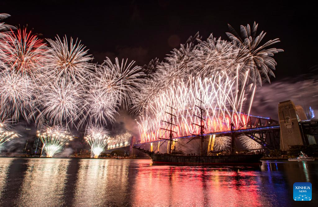 Fireworks are seen above Harbor bridge to celebrate the New Year in Sydney, Australia, Jan. 1, 2022. (Xinhua/Bai Xuefei)