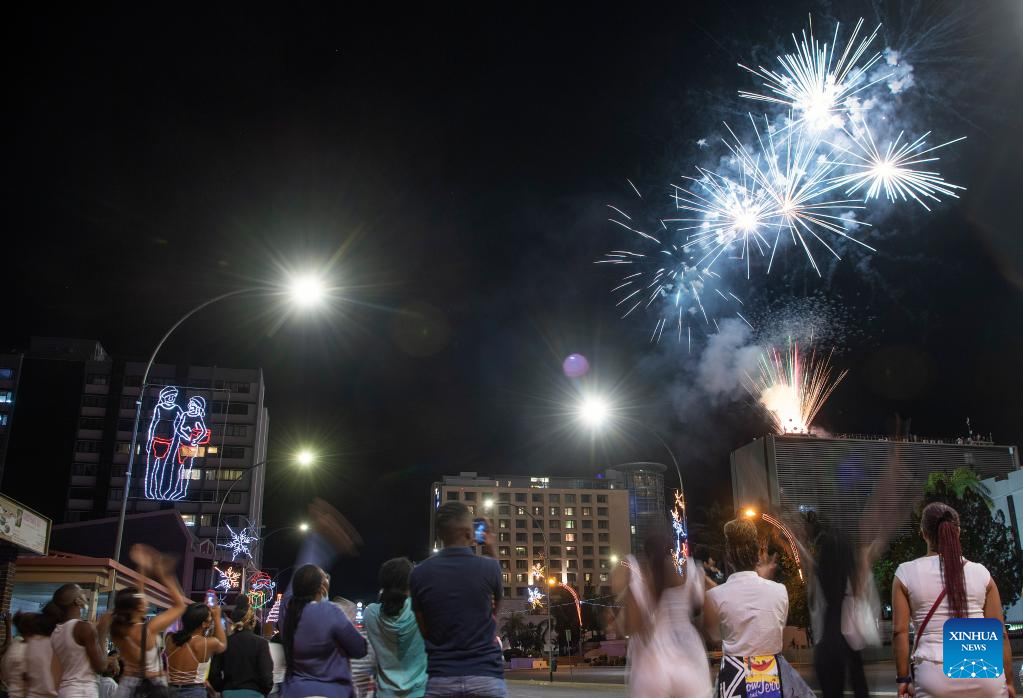 People watch fireworks celebrating the New Year in Windhoek, Namibia, Jan. 1, 2022. (Xinhua/Chen Cheng)