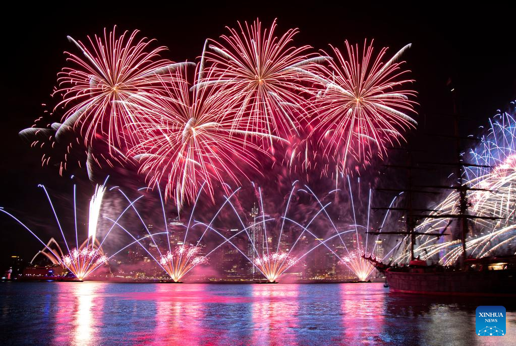 Fireworks are seen above Sydney Opera House to celebrate the New Year in Sydney, Australia, Jan. 1, 2022. (Xinhua/Bai Xuefei)