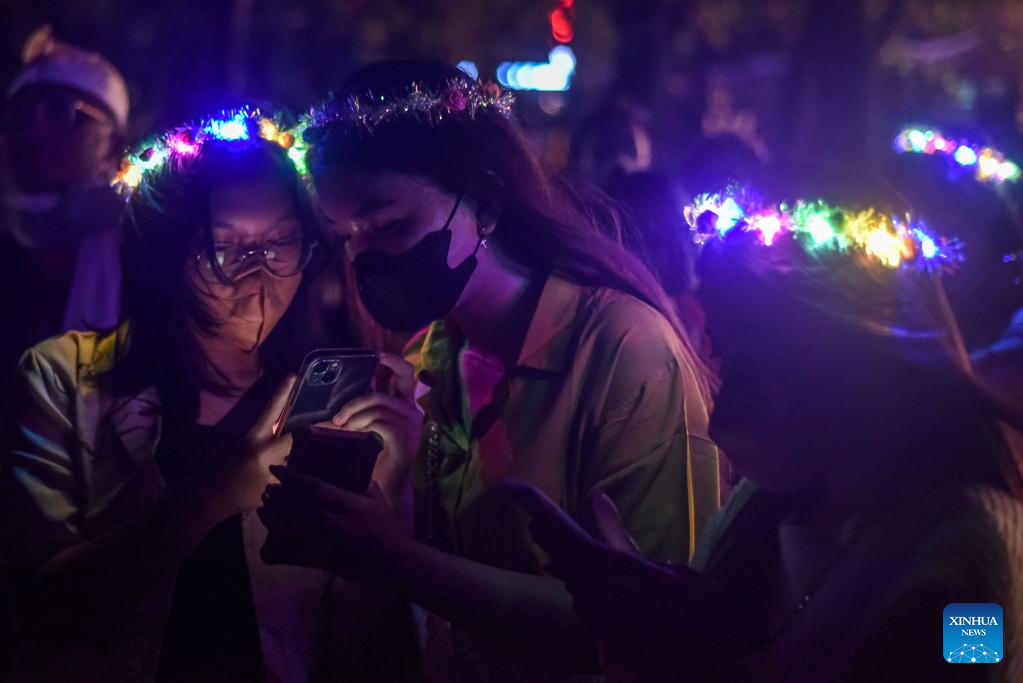 People celebrate the New Year in Minsk, Belarus, Jan. 1, 2022. (Photo by Henadz Zhinkov/Xinhua)