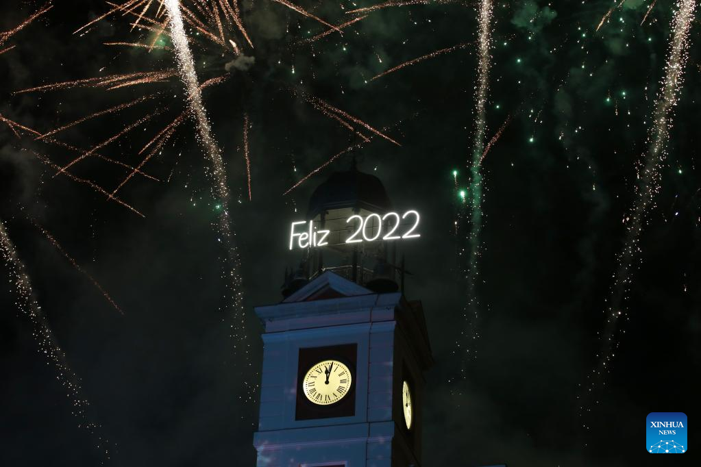Fireworks explode during New Year celebrations at Sol Plaza in Madrid, Spain, Jan. 1, 2022. (Photo by Juan Carlos Rojas/Xinhua)