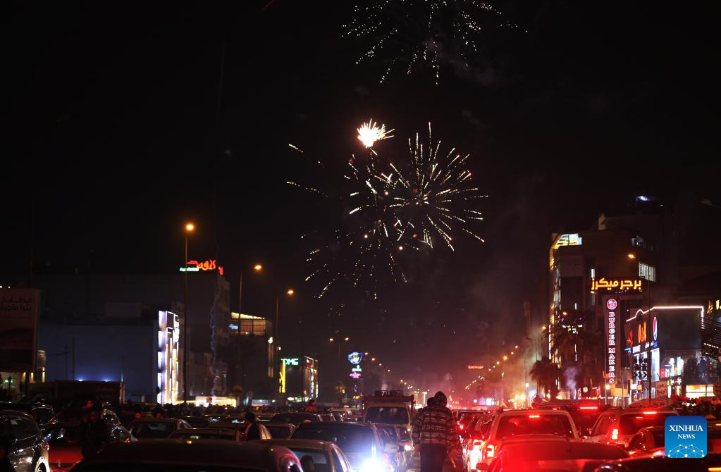 Fireworks explode during the celebration of the New Year in Baghdad, Iraq, on Dec. 31, 2021. (Xinhua/Khalil Dawood)
