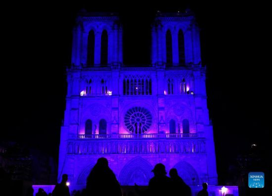 The Notre Dame cathedral is lit up in blue to celebrate the start of the French presidency of the European Union in Paris, France, Jan. 1, 2022. The most emblematic landmarks in France turned blue Saturday night to mark French presidency of the EU. (Xinhua/Gao Jing)