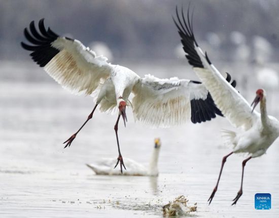 White cranes frolic at a white crane conservation area by the Poyang Lake in Nanchang, east China's Jiangxi Province, Jan. 1, 2022. (Xinhua/Wan Xiang)