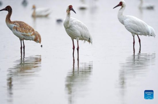 White cranes rest at a white crane conservation area by the Poyang Lake in Nanchang, east China's Jiangxi Province, Jan. 1, 2022. (Xinhua/Wan Xiang)