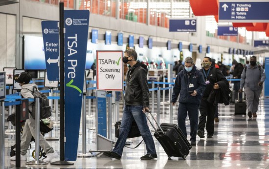 File photo taken on Nov. 25, 2020 shows travelers wearing face masks lining up for security checks at O'Hare International Airport in Chicago, the United States. (Photo by Joel Lerner/Xinhua)