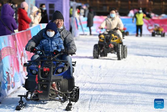 People ride snowmobiles at an ice and snow carnival held in Taoranting Park during the New Year holiday in Beijing, capital of China, Jan. 2, 2022. (Xinhua/Li He)