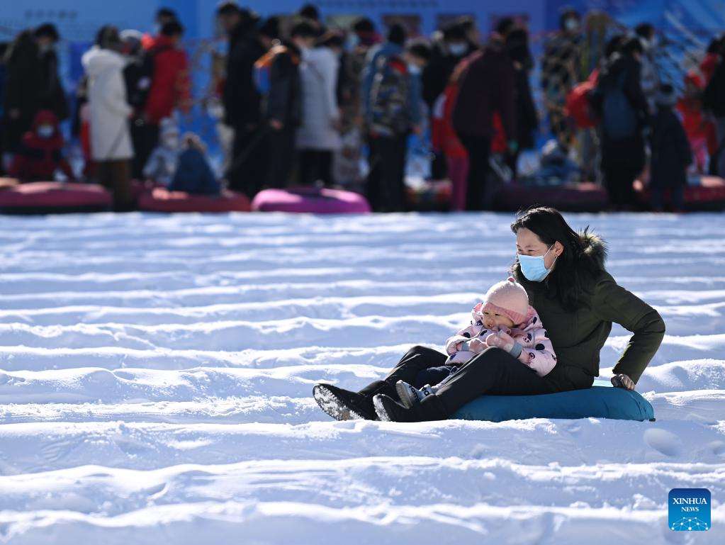People enjoy snow-tubing at an ice and snow carnival held in Taoranting Park during the New Year holiday in Beijing, capital of China, Jan. 2, 2022. (Xinhua/Li He)