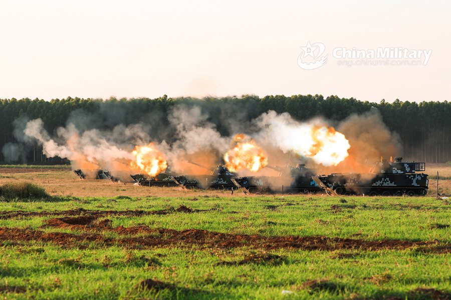 Armored vehicles attached to an amphibious detachment with a brigade under the PLA Navy's Marine Corps fire howitzers to pin down mock target during an attacking drill in early December, 2021. (eng.chinamil.com.cn/Photo by Li Ronghe)