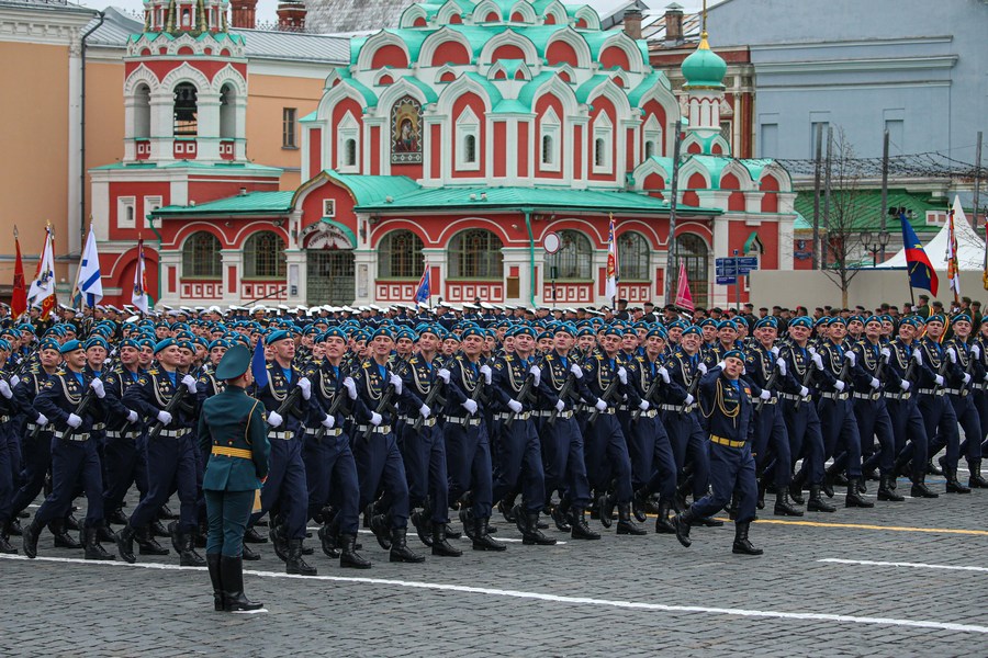 Servicemen march during the military parade marking the 76th anniversary of the Soviet victory in the Great Patriotic War, Russia's term for World War II, on Red Square in Moscow, Russia, May 9, 2021. (Xinhua/Evgeny Sinitsyn)
