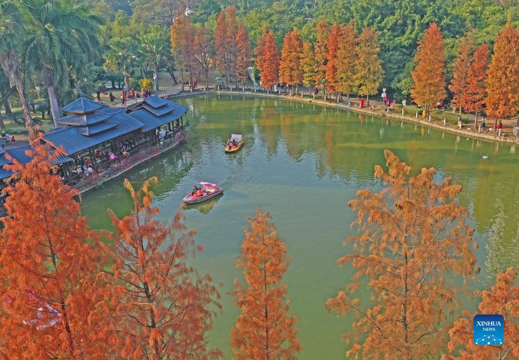 Aerial photo taken on Jan. 3, 2022 shows tourists at Jinhuacha Park in Nanning, capital of south China's Guangxi Zhuang Autonomous Region. (Xinhua/Zhou Hua)