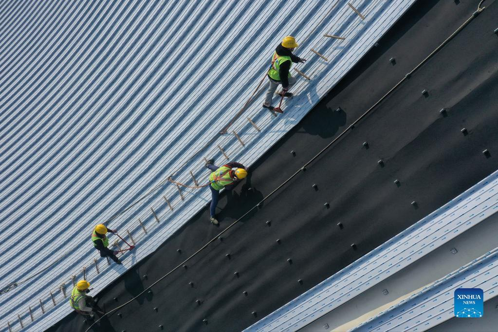 Aerial photo taken on Jan. 3, 2022 shows workers working at a construction site of a conference center in Ningbo, east China's Zhejiang Province. (Xinhua/Hu Xuejun)