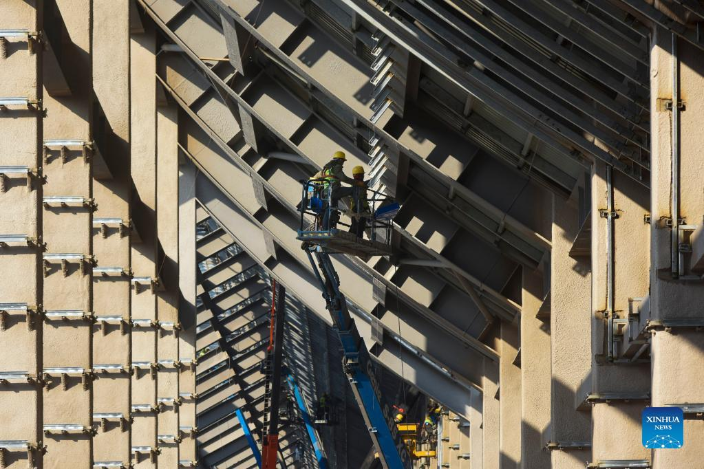 Workers are seen at a construction site of a conference center in Ningbo, east China's Zhejiang Province, Jan. 3, 2022. (Xinhua/Hu Xuejun)