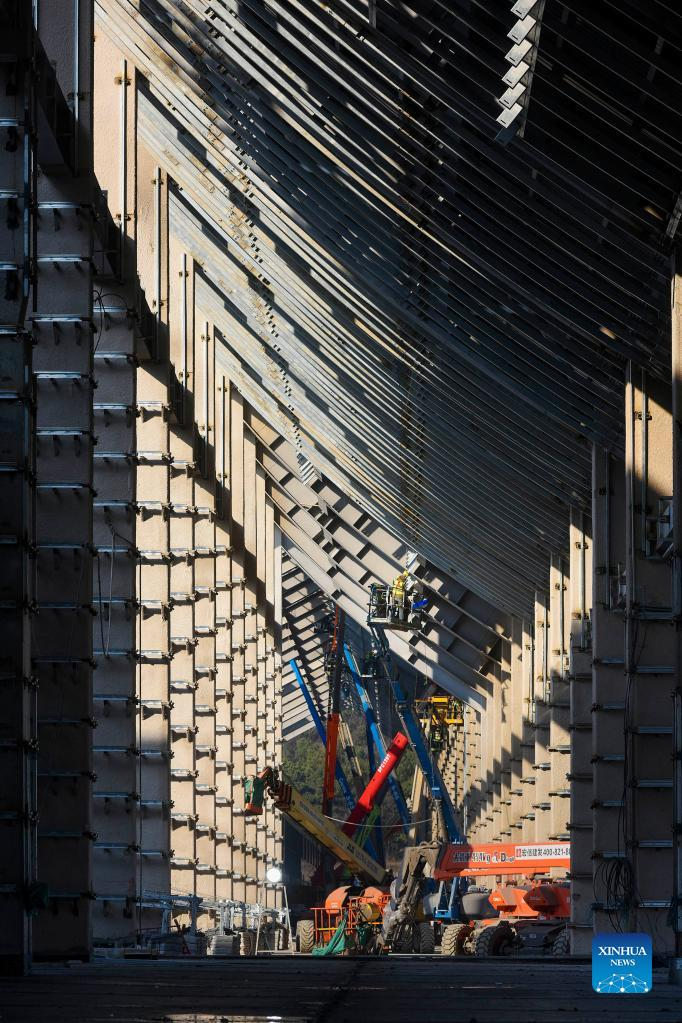 Workers are seen at a construction site of a conference center in Ningbo, east China's Zhejiang Province, Jan. 3, 2022. (Xinhua/Hu Xuejun)