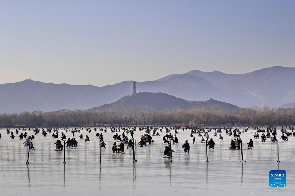 Tourists enjoy themselves on Kunming Lake of Summer Palace in Beijing. capital of China, Jan. 2, 2022. (Photo by Liu Xianguo/Xinhua)