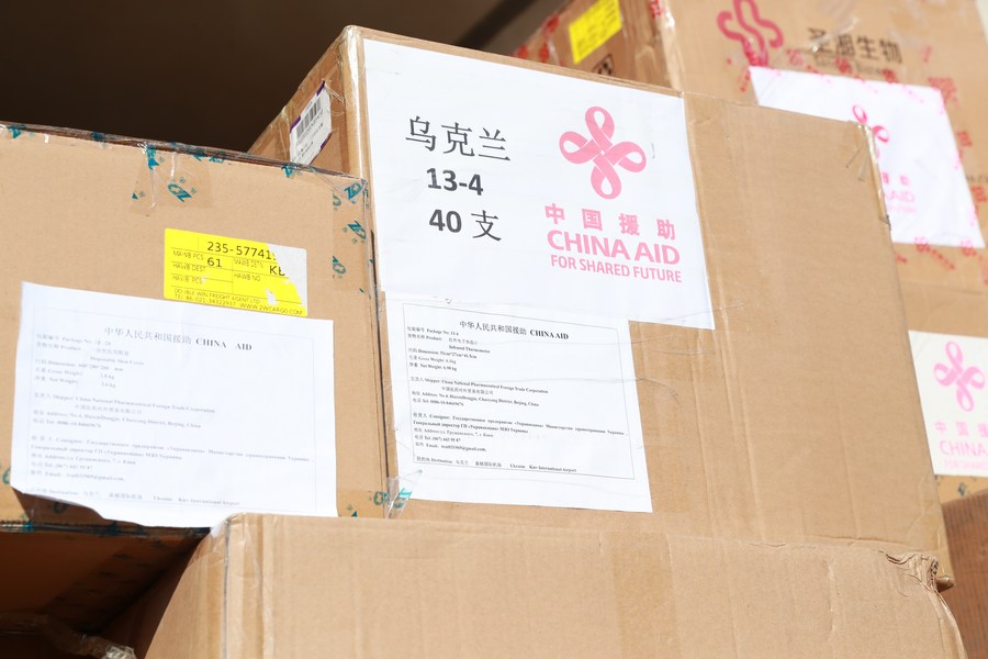 Photo taken on April 1, 2020 shows humanitarian aid from China at the Boryspil International Airport in Kiev, Ukraine. (Xinhua/Li Dongxu)