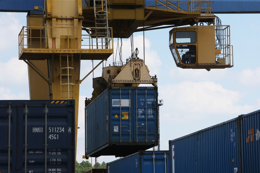 A container is unloaded from a container train from China's Wuhan in Kiev, Ukraine, July 6, 2020. (Photo by Sergey Starostenko/Xinhua)
