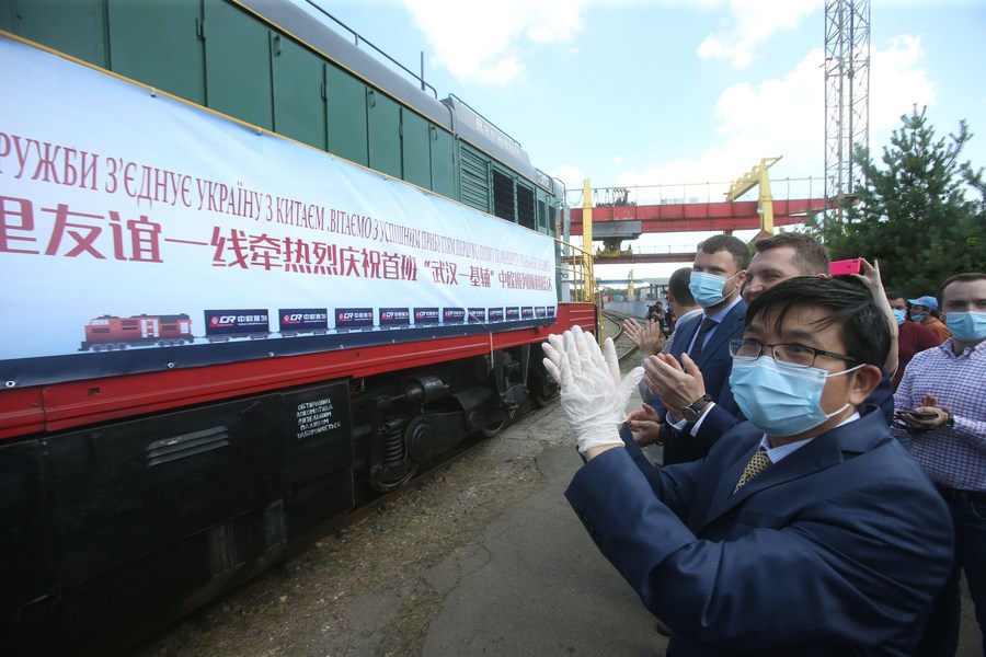 A container train from China's Wuhan is welcomed upon its arrival in Kiev, Ukraine, July 6, 2020. (Photo by Sergey Starostenko/Xinhua)