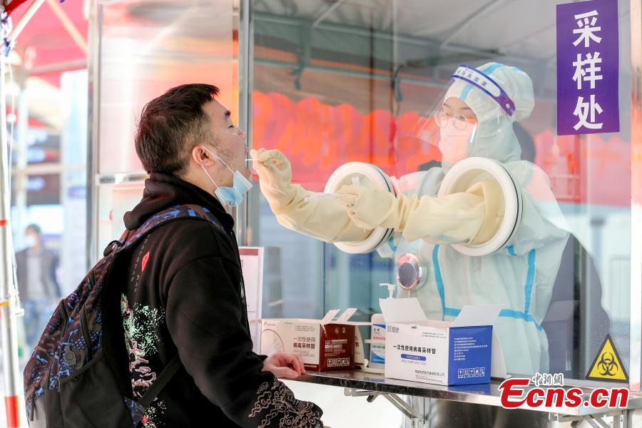 A medical worker provides nucleic acid test service for a passenger at the Nanchang Railway Station in east China's Jiangxi Province, Jan. 3, 2021. (Photo: China News Service/Bao Gansheng)