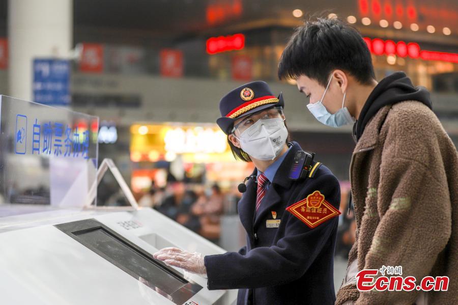 A staff member at the Nanchang Railway Station helps passengers check train information through a self-service machine, Jan. 3, 2021. (Photo: China News Service/Bao Gansheng)