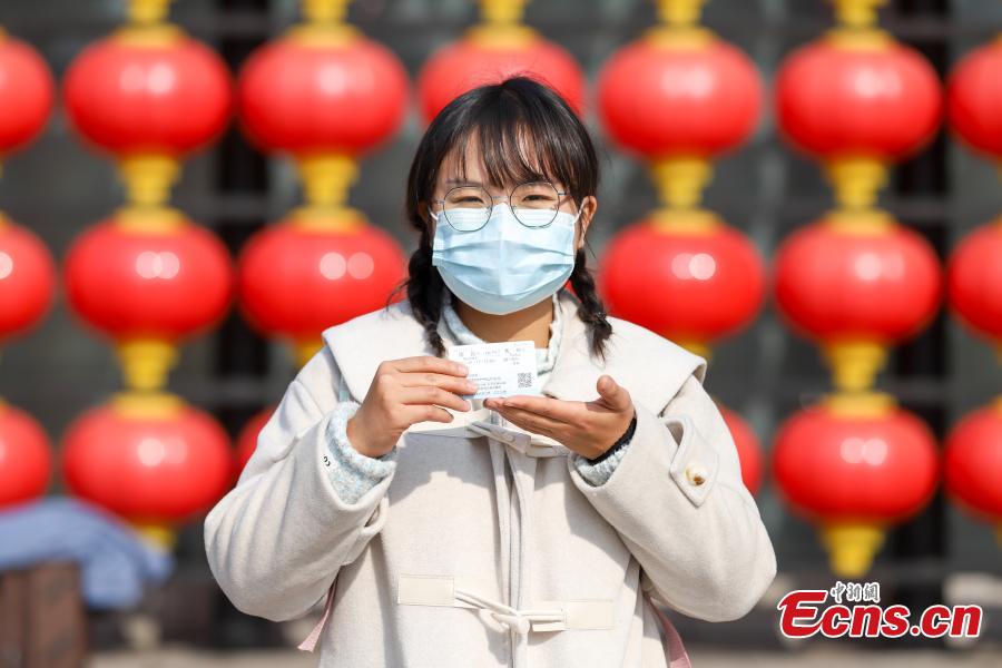 A passenger shows her train tickets outside the Nanchang Railway Station in east China's Jiangxi Province, Jan. 3, 2021. (Photo: China News Service/Bao Gansheng)
