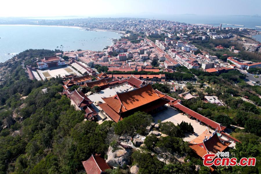 Aerial photo of the Mazu Ancestral Temple complex built on the hillside and by the sea at Meizhou Island, Putian, east China's Fujian Province, Jan. 3, 2022. (Photo: China News Service/Wang Dongming)