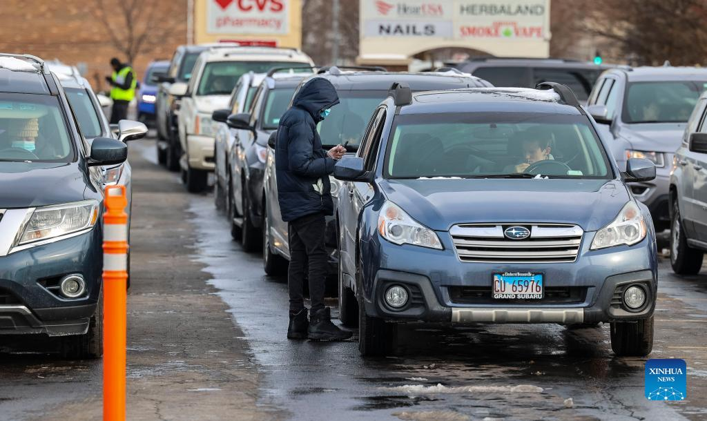 A man in a vehicle collects a swab at a pop-up COVID-19 testing site in Park Ridge, Illinois, the United States, on Jan. 4, 2022. More than 103,000 people are currently hospitalized with COVID-19 in the United States, the first time the total has reached six figures in nearly four months, CNN on Tuesday quoted the latest data from the U.S. Department of Health and Human Services as saying. (Photo by Joel Lerner/Xinhua)