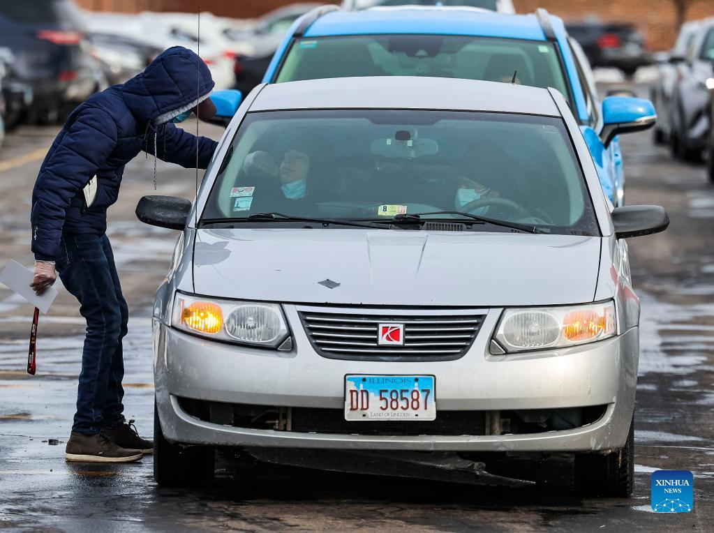 A medical worker collects a swab from a person in a vehicle at a pop-up COVID-19 testing site in Park Ridge, Illinois, the United States, on Jan. 4, 2022. More than 103,000 people are currently hospitalized with COVID-19 in the United States, the first time the total has reached six figures in nearly four months, CNN on Tuesday quoted the latest data from the U.S. Department of Health and Human Services as saying. (Photo by Joel Lerner/Xinhua)
