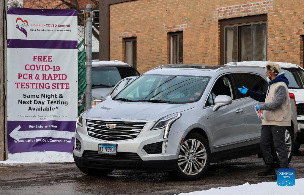 A medical worker collects a COVID-19 test sample at a pop-up COVID-19 testing site in Evanston, Illinois, the United States, on Jan. 4, 2022. More than 103,000 people are currently hospitalized with COVID-19 in the United States, the first time the total has reached six figures in nearly four months, CNN on Tuesday quoted the latest data from the U.S. Department of Health and Human Services as saying. (Photo by Joel Lerner/Xinhua)