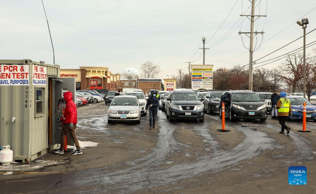 Medical staff work at a pop-up COVID-19 testing site in Park Ridge, Illinois, the United States, on Jan. 4, 2022. More than 103,000 people are currently hospitalized with COVID-19 in the United States, the first time the total has reached six figures in nearly four months, CNN on Tuesday quoted the latest data from the U.S. Department of Health and Human Services as saying. (Photo by Joel Lerner/Xinhua)