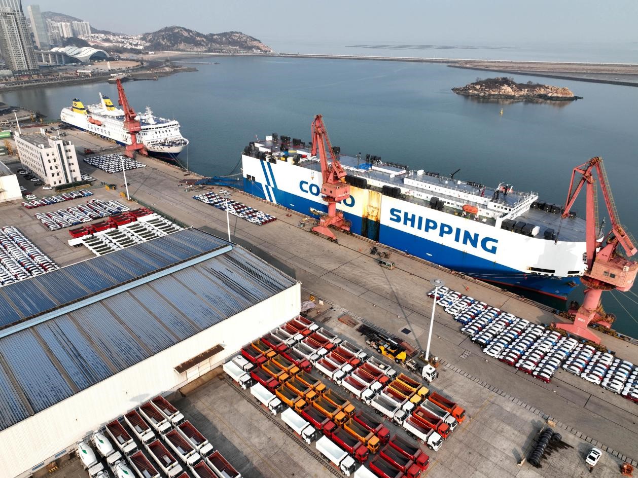 China-made vehicles are being loaded onto an oceangoing roll-on-roll-off ship for exportation, Jan. 3, 2022. (People’s Daily Online/ Wang Chun)