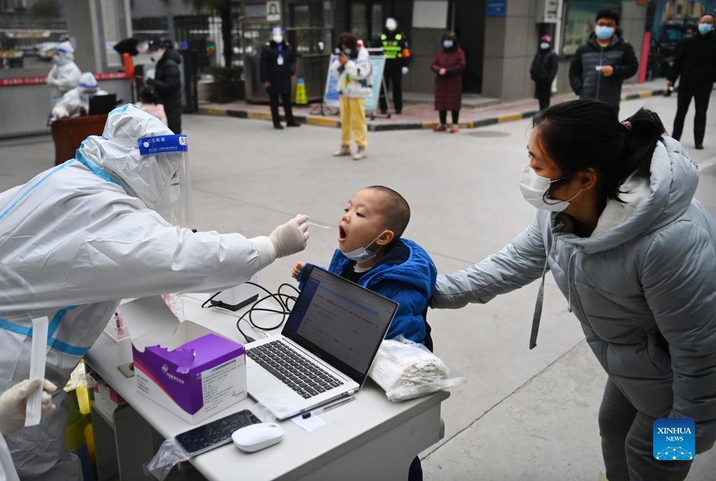 A kid receives nucleic acid test at a testing site in Xincheng District of Xi'an, northwest China's Shaanxi Province, Jan. 4, 2022. Xi'an launched a new round of all-inclusive nucleic acid testing on Tuesday to help curb the spread of COVID-19. (Xinhua/Tao Ming)